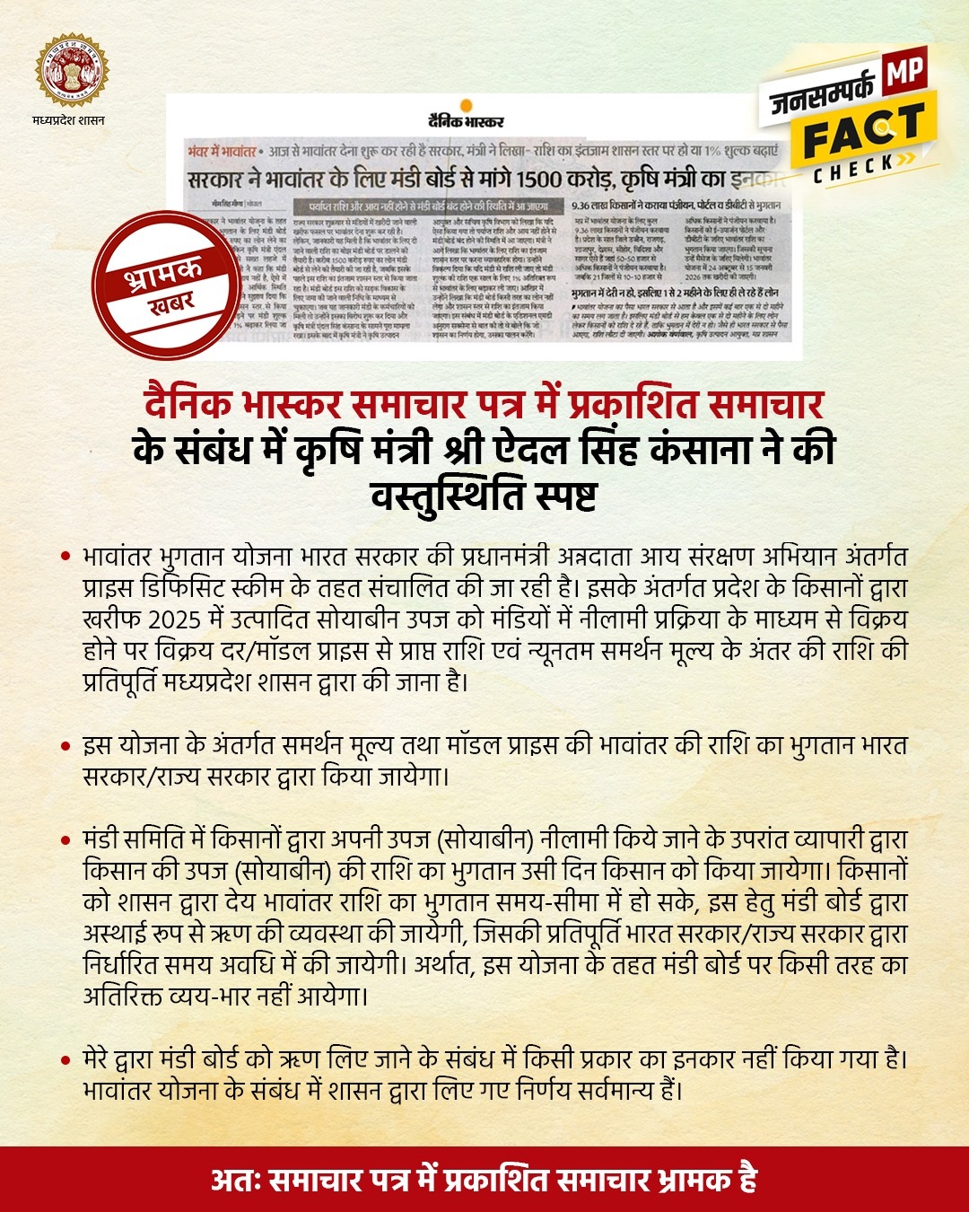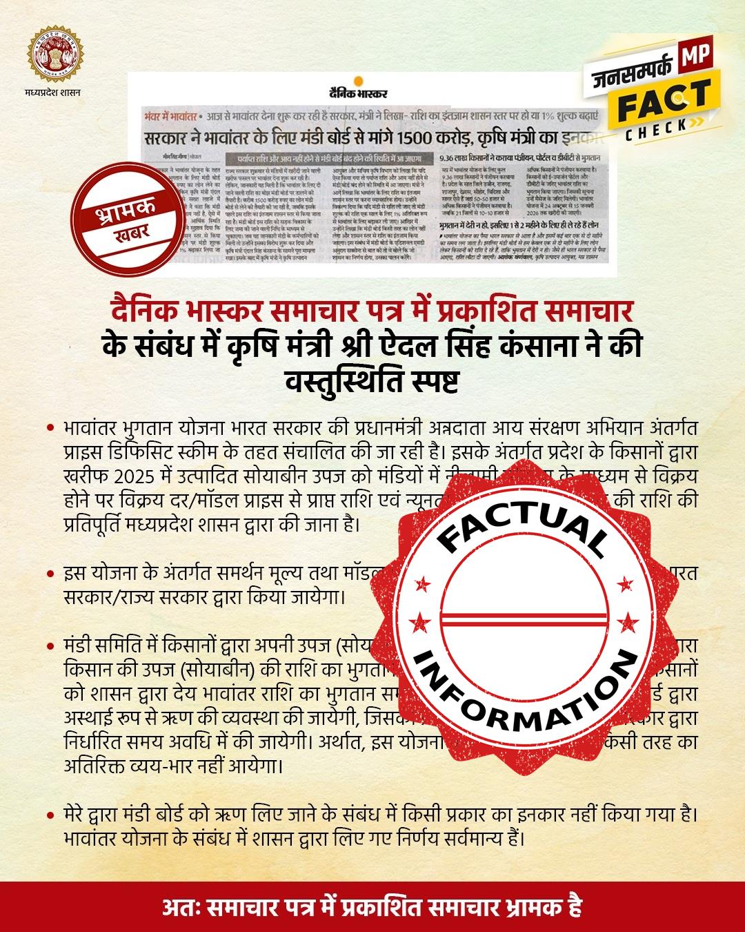 #DPRFactCheck: दैनिक भास्कर समाचार पत्र में प्रकाशित समाचार के संबंध में कृषि मंत्री श्री ऐदल सिंह कंसाना ने की वस्तुस्थिति स्पष्ट