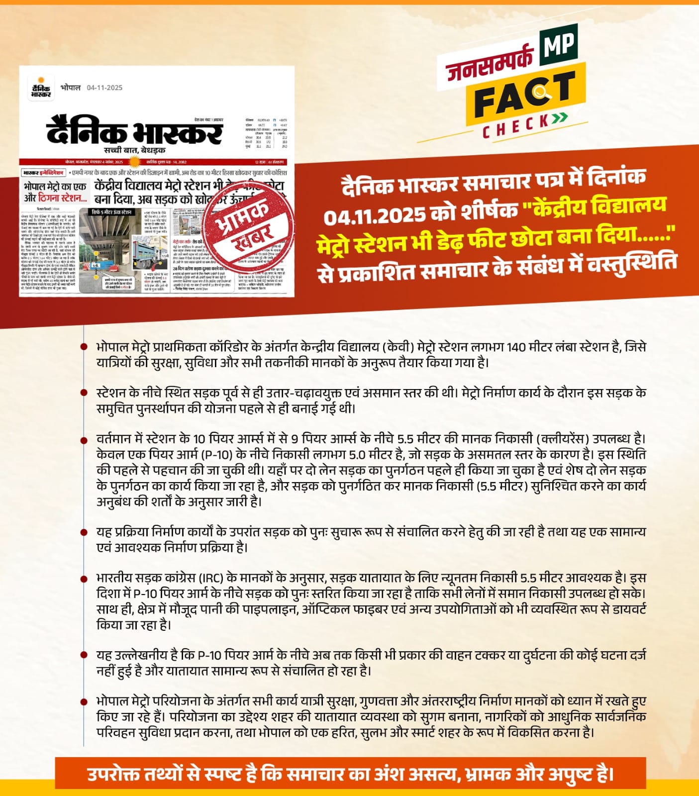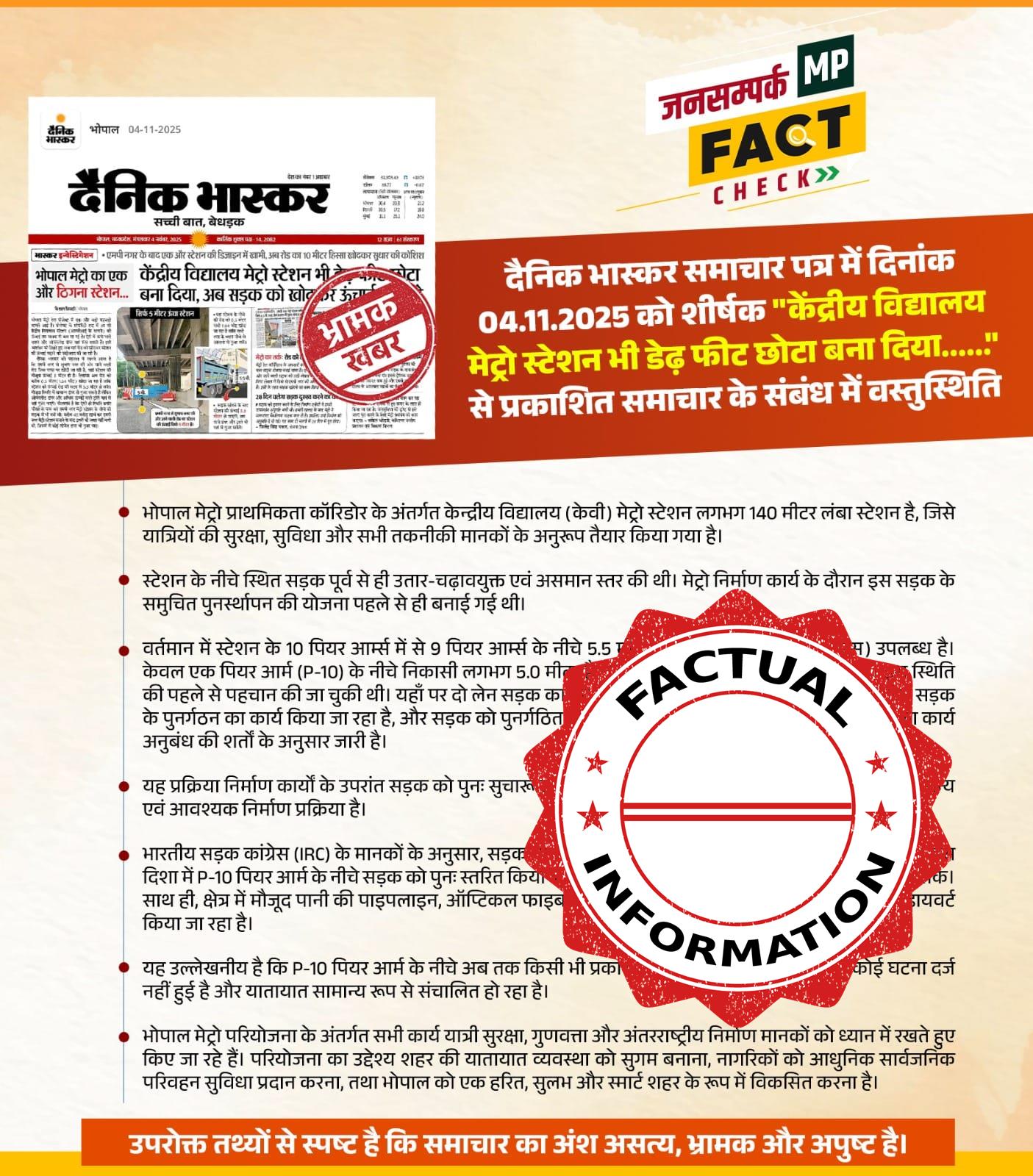 #DPRFactCheck: दैनिक भास्कर समाचार पत्र में दिनांक 04.11.2025 को शीर्षक "केंद्रीय विद्यालय मेट्रो स्टेशन भी डेढ़ फीट छोटा बना दिया......" से प्रकाशित समाचार के संबंध में वस्तुस्थिति।