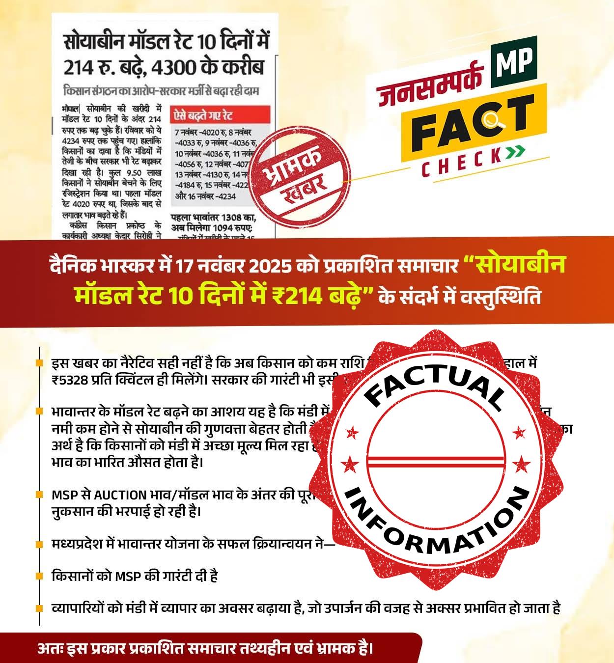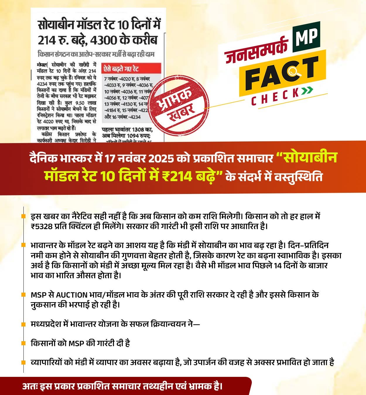 #DPRFactCheck: दैनिक भास्कर में 17 नवंबर 2025 को प्रकाशित समाचार "सोयाबीन मॉडल रेट 10 दिनों में ₹ 214 बढ़े" के संदर्भ में वस्तुस्थिति।