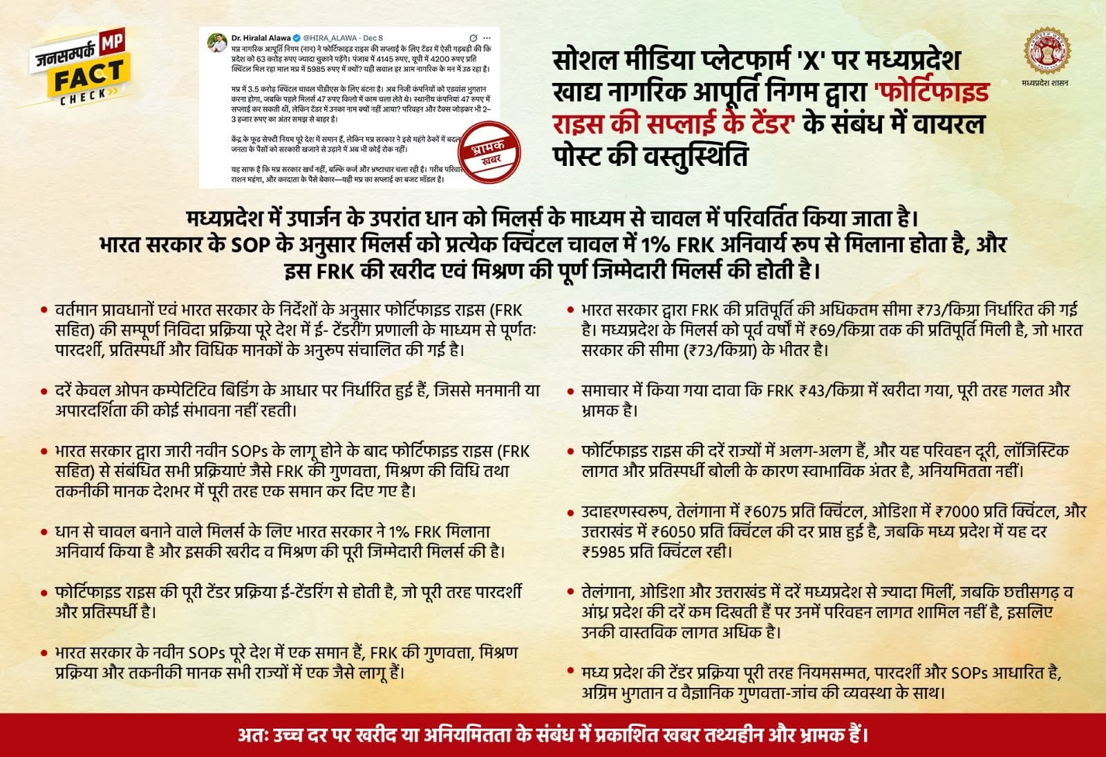#DPRFactCheck: मध्यप्रदेश में उपार्जन के उपरांत धान को मिलर्स के माध्यम से चावल में परिवर्तित किया जाता है। भारत सरकार के SOP के अनुसार मिलर्स को प्रत्येक क्विंटल चावल में 1 प्रतिशत FRK अनिवार्य रूप से मिलाना होता है, और इस FRK की खरीद एवं मिश्रण की पूर्ण जिम्मेदारी मिलर्स की होती है।