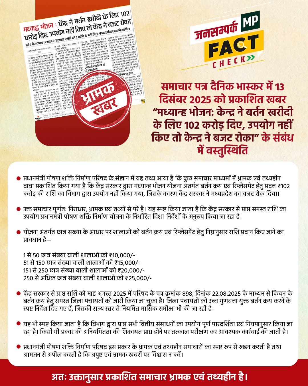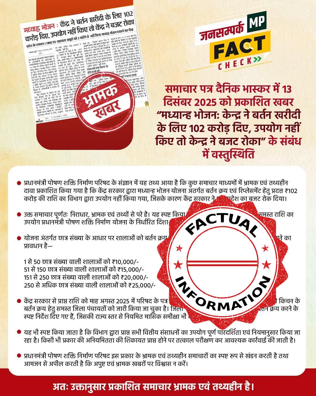 #DPRFactCheck: समाचार पत्र दैनिक भास्कर में 13 दिसंबर 2025 को प्रकाशित खबर "मध्यान्ह भोजनः केन्द्र ने बर्तन खरीदी के लिए 102 करोड़ दिए, उपयोग नहीं किए तो केन्द्र ने बजट रोका" के संबंध में वस्तुस्थिति।