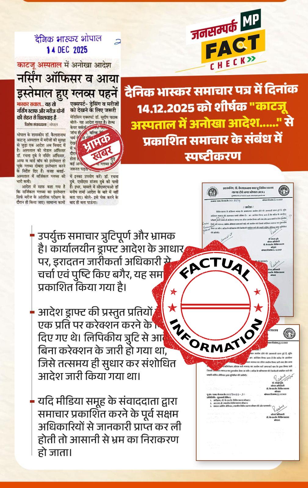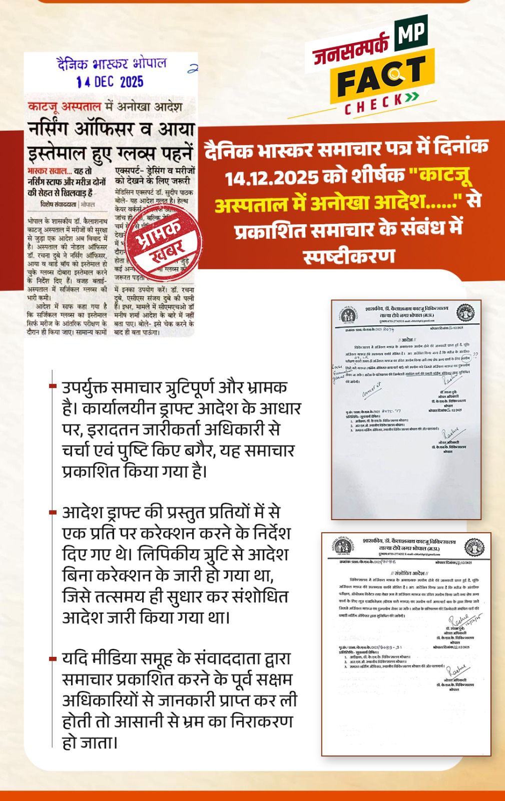#DPRFactCheck: दैनिक भास्कर समाचार पत्र में दिनांक 14.12.2025 को शीर्षक "काटजू अस्पताल में अनोखा आदेश......" से प्रकाशित समाचार के संबंध में स्पष्टीकरण।