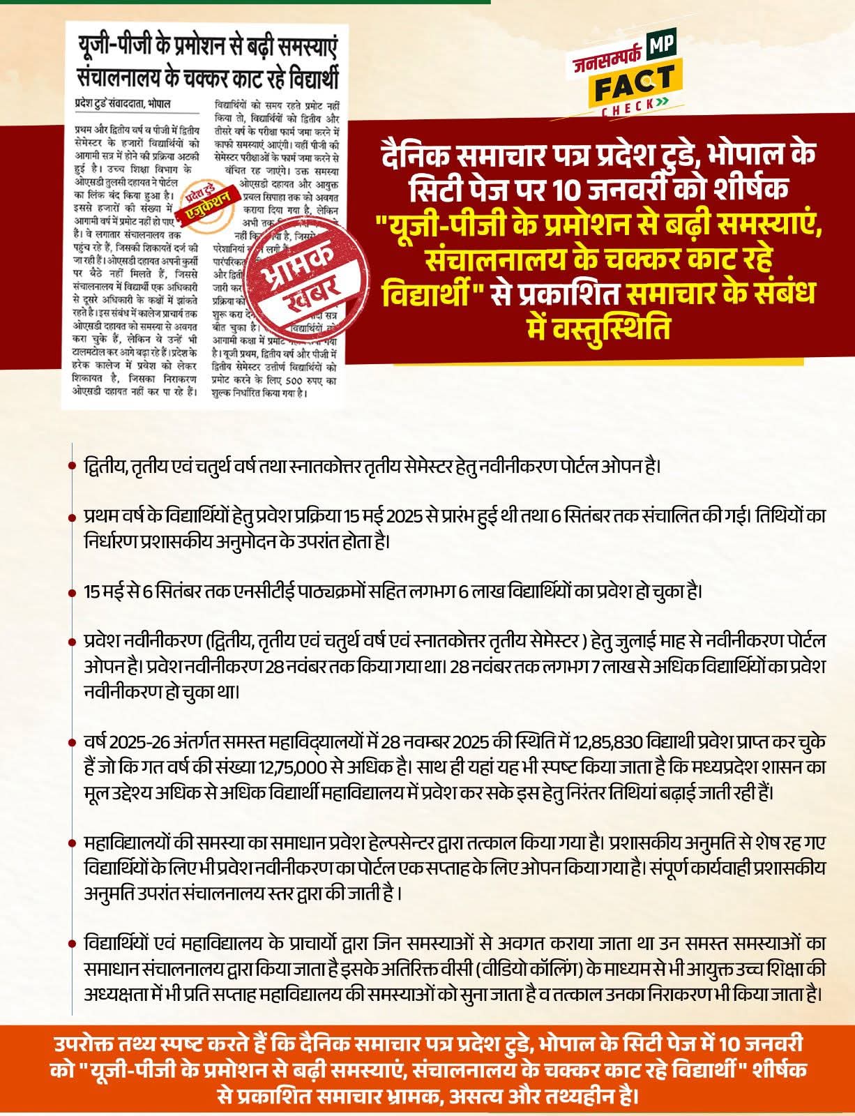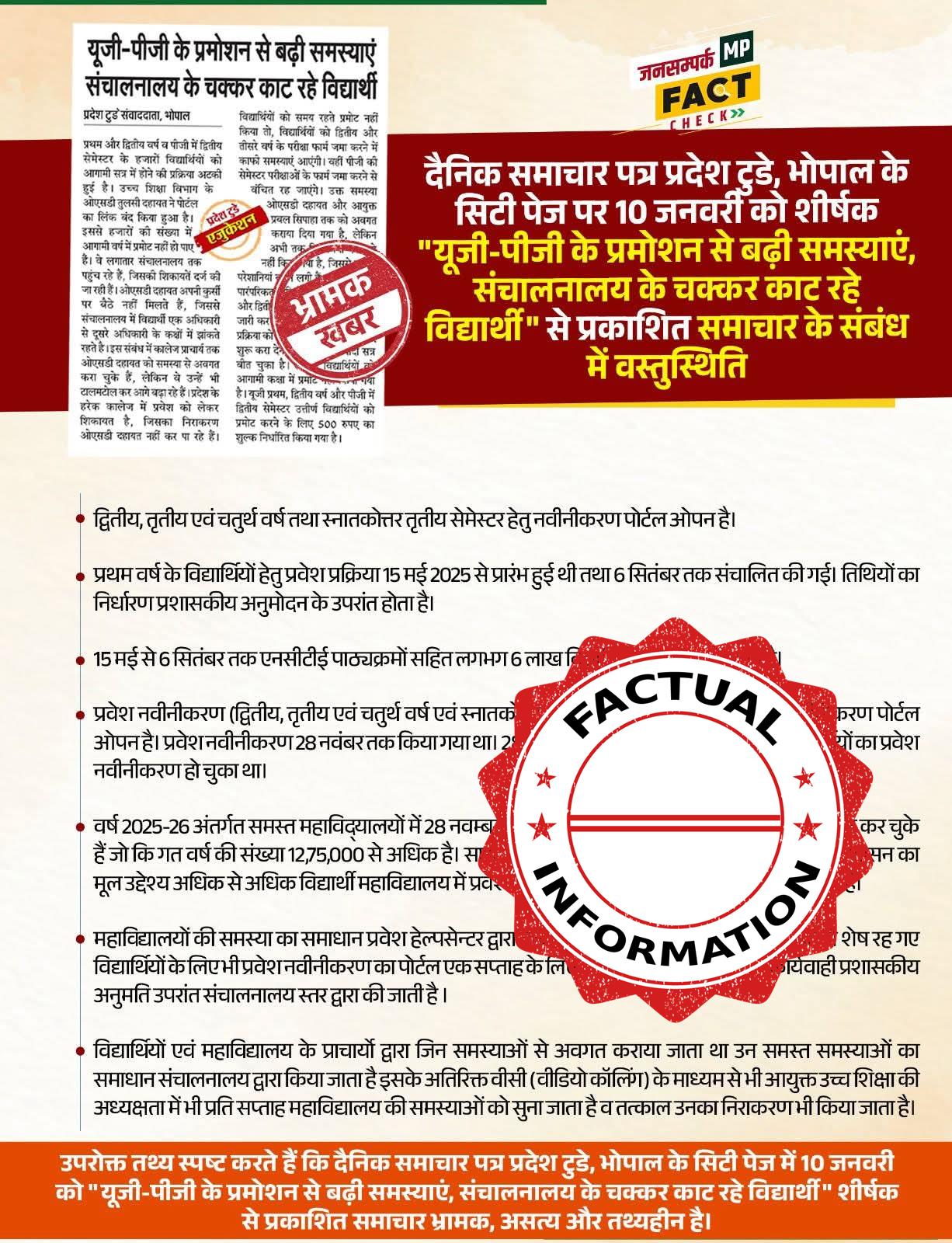#DPRFactCheck: दैनिक समाचार पत्र प्रदेश टुडे, भोपाल के सिटी पेज पर 10 जनवरी को शीर्षक "यूजी-पीजी के प्रमोशन से बढ़ी समस्याएं, संचालनालय के चक्कर काट रहे विद्यार्थी" से प्रकाशित समाचार के संबंध में वस्तुस्थिति।