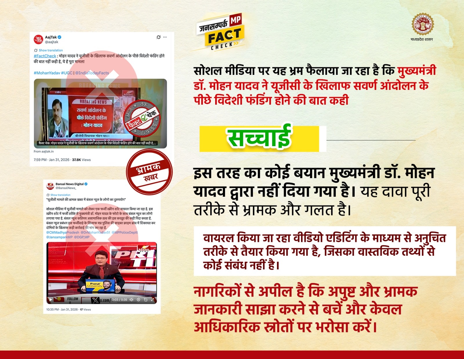 सोशल मीडिया पर यह भ्रम फैलाया जा रहा है कि मुख्यमंत्री डॉ. मोहन यादव ने यूजीसी के खिलाफ सवर्ण आंदोलन के पीछे विदेशी फंडिंग होने की बात कही।
