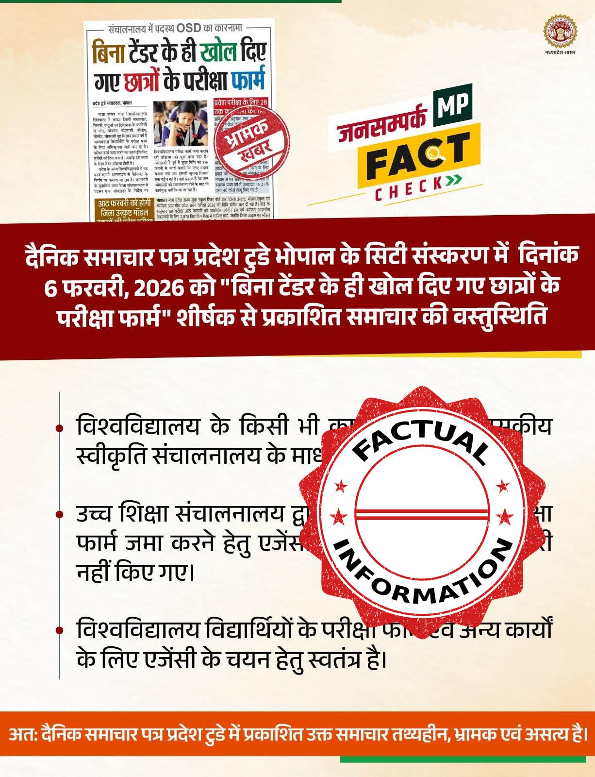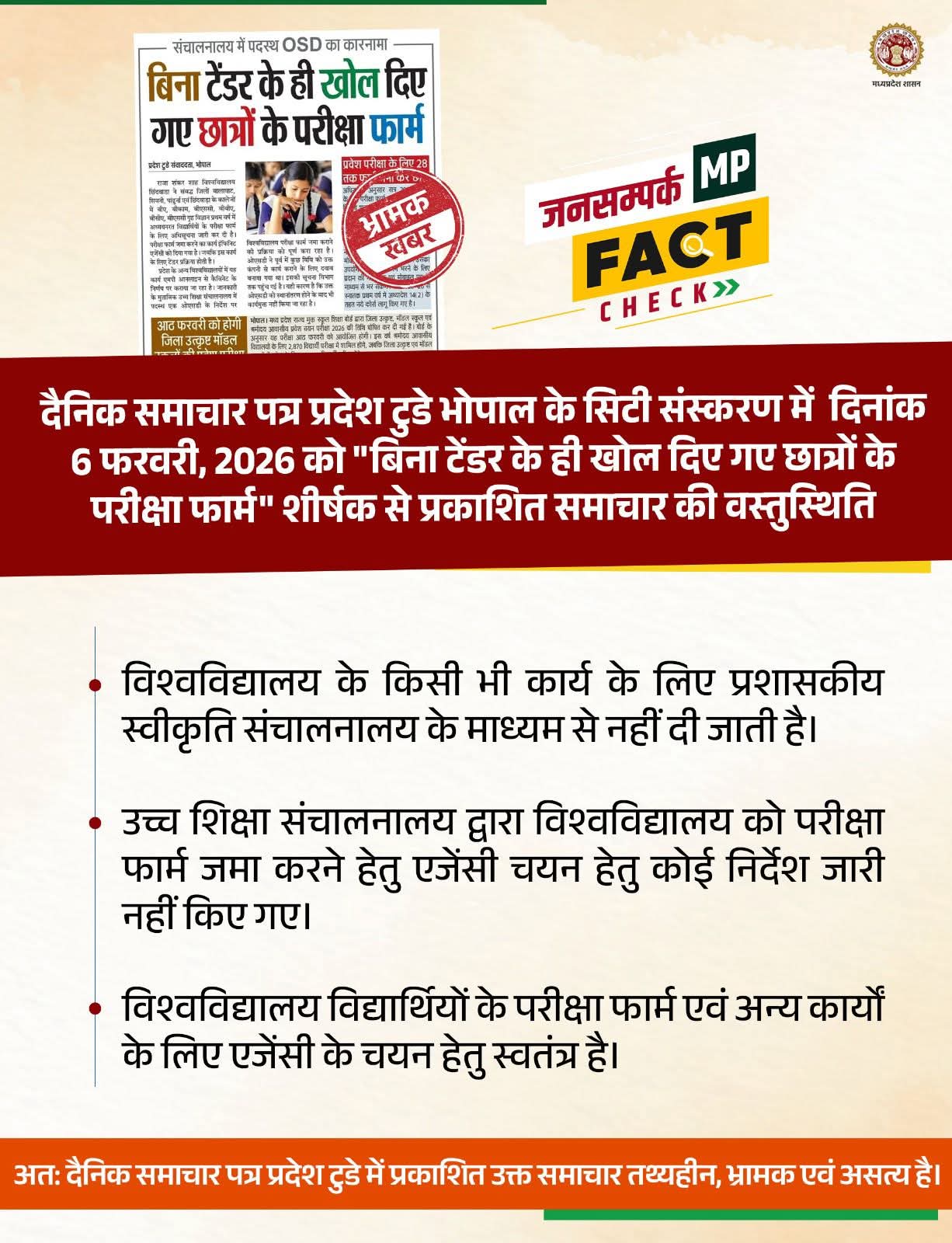 #DPRFactCheck: दैनिक समाचार पत्र प्रदेश टुडे भोपाल के सिटी संस्करण में दिनांक 6 फरवरी, 2026 को "बिना टेंडर के ही खोल दिए गए छात्रों के परीक्षा फार्म" शीर्षक से प्रकाशित समाचार की वस्तुस्थिति।