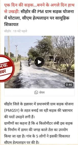 एक दिन की सड़क... बनने के अगले दिन हाथ से उखड़ी: सीहोर की PM ग्राम सड़क योजना में घोटाला, सीएम हेल्पलाइन पर सामूहिक शिकायत।