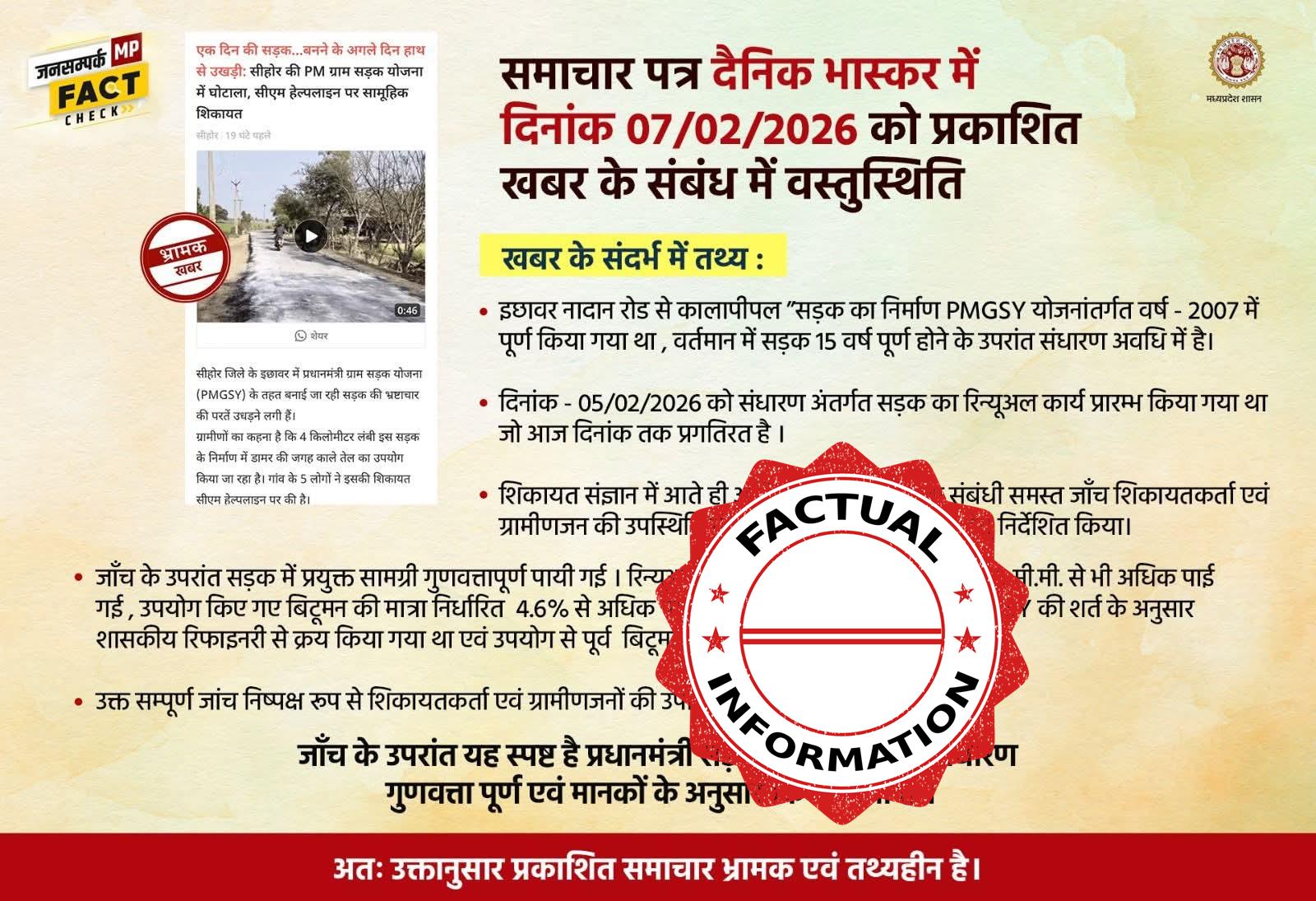 #DPRFactCheck: समाचार पत्र दैनिक भास्कर में दिनांक 07/02/2026 को प्रकाशित खबर के संबंध में वस्तुस्थिति।